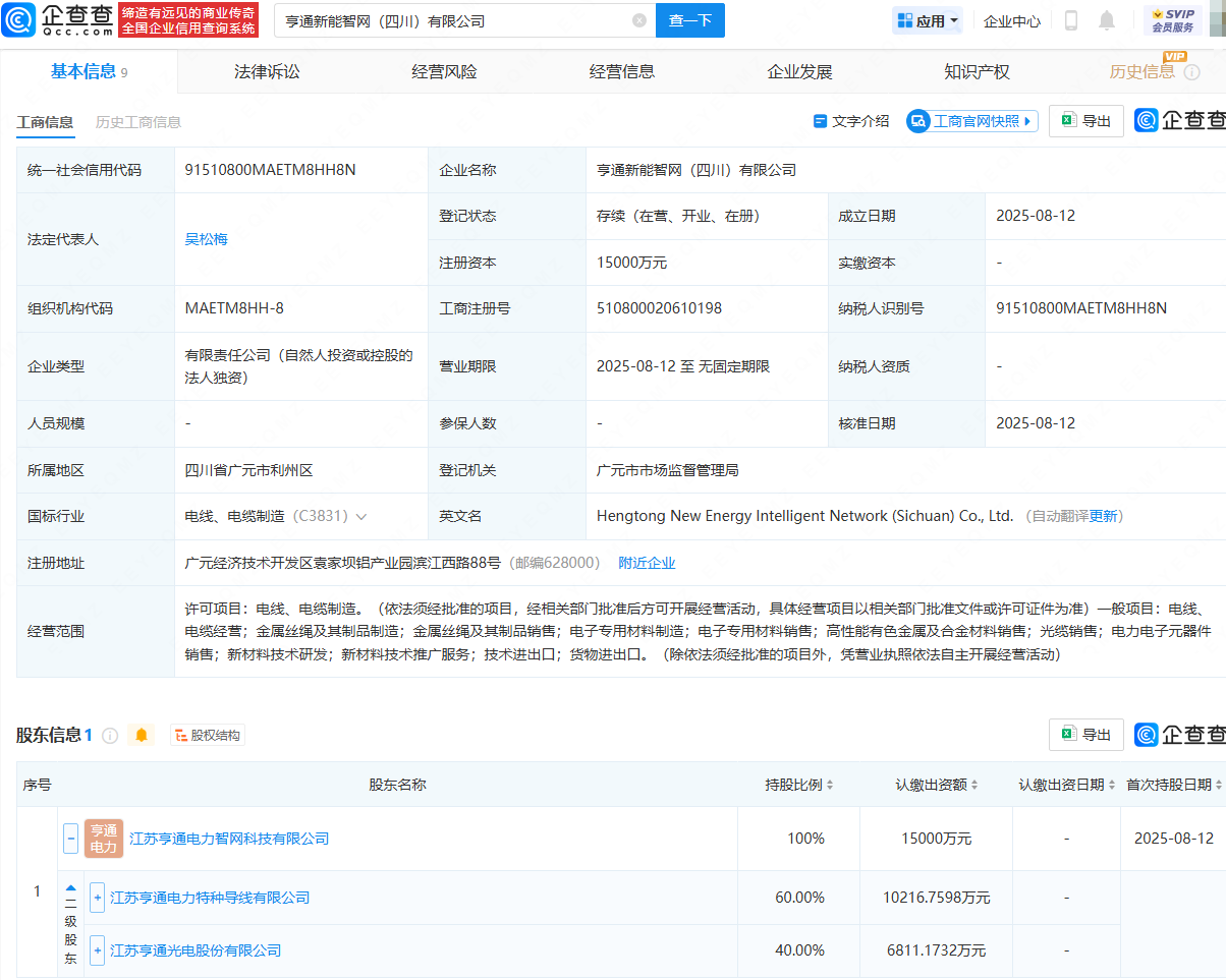 近日股票配资代理网,亨通新能智网(四川)有限公司成立,法定代表人为吴松梅,注册资本为1.5亿元,经营范围包含:电线、电缆制造;金属丝绳及其制品制造;电子专用材料制造;光缆销售;电力电子元器件销售等。企查查股权穿透显示,该公司由江苏亨通电力智网科技有限公司全资持股,后者由江苏亨通电力特种导线有限公司、亨通光电(600487)共同持股。