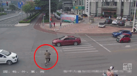 2020年,广西柳州,一位老人骑自行车行驶至事发路口时,交通信号灯显示为红灯,自行车未按照红灯信号等候通行,强行穿过路口,撞上一辆小轿车。
